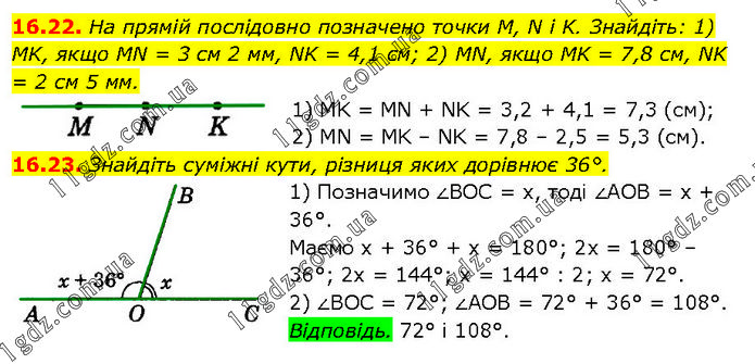 16.22. На прямій послідовно позначено точки М, N i K. Знайдіть: 1) MK, якщо MN = 3 см 2 мм, NK = 4,1 см; 2) MN, якщо MK = 7,8 см, NK = 2 см 5 мм. 1) MK = MN + NK = 3,2 + 4,1 = 7,3 (см); 2) MN = MK – NK = 7,8 – 2,5 = 5,3 (см). 16.23. Знайдіть суміжні кути, різниця яких дорівнює 36°. 1) Позначимо ∠BOC = х, тоді ∠AOB = х + 36°. Маємо х + 36° + х = 180°; 2х = 180° – 36°; 2х = 144°; х = 144° : 2; х = 72°. 2) ∠BOC = 72°; ∠AOB = 72° + 36° = 108°. Відповідь. 72° і 108°.