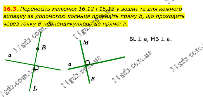 Перенесіть малюнки 16.12 і 16.13 у зошит та для кожного випадку за допомогою косинця проведіть пряму b, що проходить через точку В перпендикулярно до прямої а. BL ⊥ a, MB ⊥ a.
