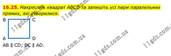 Накресліть квадрат ABCD та запишіть усі пари паралельних прямих, які утворилися. AB ∥ CD; BC ∥ AD.