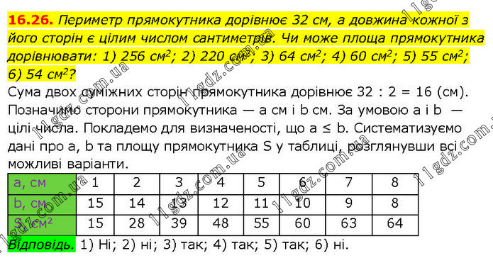 Периметр прямокутника дорівнює 32 см, а довжина кожної з його сторін є цілим числом сантиметрів. Чи може площа прямокутника дорівнювати: 1) 256 см2; 2) 220 см2; 3) 64 см2; 4) 60 см2; 5) 55 см2; 6) 54 см2? Сума двох суміжних сторін прямокутника дорівнює 32 : 2 = 16 (см). Позначимо сторони прямокутника — а см і b см. За умовою а і b — цілі числа. Покладемо для визначеності, що a ≤ b. Систематизуємо дані про а, b та площу прямокутника S у таблиці, розглянувши всі можливі варіанти.