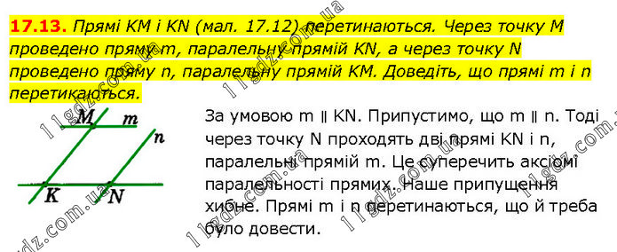 Прямі KM і KN (мал. 17.12) перетинаються. Через точку M проведено пряму m, паралельну прямій KN, а через точку N проведено пряму n, паралельну прямій KM. Доведіть, що прямі m і n перетикаються. За умовою m ∥ KN. Припустимо, що m ∥ n. Тоді через точку N проходять дві прямі KN і n, паралельні прямій m. Це суперечить аксіомі паралельності прямих. Наше припущення хибне. Прямі m i n перетинаються, що й треба було довести.