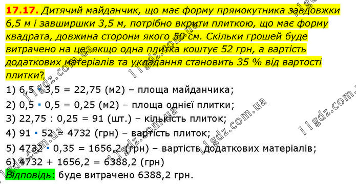 Дитячий майданчик, що має форму прямокутника завдовжки 6,5 м і завширшки 3,5 м, потрібно вкрити плиткою, що має форму квадрата, довжина сторони якого 50 см. Скільки грошей буде витрачено на це, якщо одна плитка коштує 52 грн, а вартість додаткових матеріалів та укладання становить 35 % від вартості плитки? 1) 6,5 ∙ 3,5 = 22,75 (м2) – площа майданчика; 2) 0,5 ∙ 0,5 = 0,25 (м2) – площа однієї плитки; 3) 22,75 : 0,25 = 91 (шт.) – кількість плиток; 4) 91 ∙ 52 = 4732 (грн) – вартість плиток; 5) 4732 ∙ 0,35 = 1656,2 (грн) – вартість додаткових матеріалів; 6) 4732 + 1656,2 = 6388,2 (грн) Відповідь: буде витрачено 6388,2 грн.