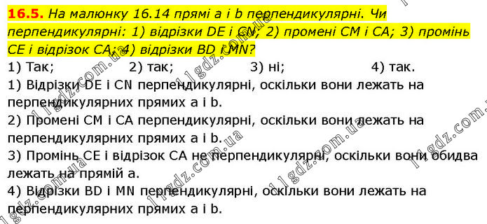 На малюнку 16.14 прямі а і b перпендикулярні. Чи перпендикулярні: 1) відрізки DE і CN; 2) промені CM і CA; 3) промінь CE і відрізок CA; 4) відрізки BD і MN? 1) Так; 2) так; 3) ні; 4) так. 1) Відрізки DЕ і СN перпендикулярні, оскільки вони лежать на перпендикулярних прямих а і b. 2) Промені СМ і СА перпендикулярні, оскільки вони лежать на перпендикулярних прямих a і b. 3) Промінь СЕ і відрізок СА не перпендикулярні, оскільки вони обидва лежать на прямій а. 4) Відрізки ВD і МN перпендикулярні, оскільки вони лежать на перпендикулярних прямих а і b.