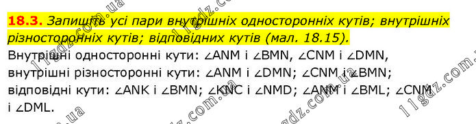 18.3. Запишіть усі пари внутрішніх односторонніх кутів; внутрішніх різносторонніх кутів; відповідних кутів (мал. 18.15). Внутрішні односторонні кути: ∠ANM і ∠BMN, ∠CNM i ∠DMN, внутрішні різносторонні кути: ∠ANM і ∠DMN; ∠CNM i ∠BMN; відповідні кути: ∠ANK і ∠BMN; ∠KNC і ∠NMD; ∠ANM і ∠BML; ∠CNM і ∠DML.