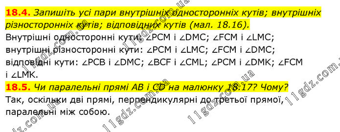 18.4. Запишіть усі пари внутрішніх односторонніх кутів; внутрішніх різносторонніх кутів; відповідних кутів (мал. 18.16). Внутрішні односторонні кути: ∠PCM і ∠DMC; ∠FCM і ∠LMC; внутрішні різносторонні кути: ∠PCM і ∠LMC; ∠FCM і ∠DMC; відповідні кути: ∠PCB і ∠DMC; ∠BCF і ∠CML; ∠PCM і ∠DMK; ∠FCM і ∠LMK. 18.5. Чи паралельні прямі AB і CD на малюнку 18.17? Чому? Так, оскільки дві прямі, перпендикулярні до третьої прямої, паралельні між собою.