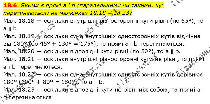 Якими є прямі а і b (паралельними чи такими, що перетинаються) на малюнках 18.18 – 18.23? Мал. 18.18 — оскільки внутрішні різносторонні кути рівні (по 65°), то а ∥ b. Мал. 18.19 — оскільки сума внутрішніх односторонніх кутів відмінна від 180° (бо 45° + 130° = 175°), то прямі а і b перетинаються. Мал. 18.20 — оскільки відповідні кути рівні (по 50°), то а ∥ b. Мал. 18.21 — оскільки внутрішні різносторонні кути не рівні, то прямі а і b перетинаються. Мал. 18.22 — оскільки сума внутрішніх односторонніх кутів дорівнює 180° (100° + 80° = 180°), то а ∥ b. Мал. 18.23 — оскільки відповідні кути не рівні між собою, то прямі а і b перетинаються.