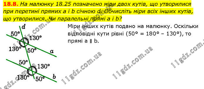 На малюнку 18.25 позначено міри двох кутів, що утворилися при перетині прямих а і b січною d. Обчисліть міри всіх інших кутів, що утворилися. Чи паралельні прямі а і b? Міри інших кутів подано на малюнку. Оскільки відповідні кути рівні (50° = 180° – 130°), то прямі а ∥ b.