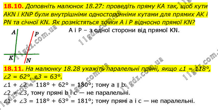 Доповніть малюнок 18.27: проведіть пряму KA так, щоб кути AKN і KNP були внутрішніми односторонніми кутами для прямих AK і PN та січної KN. Як розмістяться точки А і P відносно прямої KN? A i P – з одної сторони від прямої KN. 18.11. На малюнку 18.28 укажіть паралельні прямі, якщо ∠1 = 118°, ∠2 = 62°, ∠3 = 63°. ∠1 + ∠2 = 118° + 62° = 180°; тому а ∥ b. ∠2 ≠ ∠3, тому прямі b і с — не паралельні. ∠1 + ∠3 = 118° + 63° = 181°; тому прямі а і с — не паралельні.