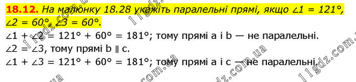 На малюнку 18.28 укажіть паралельні прямі, якщо ∠1 = 121°, ∠2 = 60°, ∠3 = 60°. ∠1 + ∠2 = 121° + 60° = 181°; тому прямі а і b — не паралельні. ∠2 = ∠3, тому прямі b ∥ с. ∠1 + ∠3 = 121° + 60° = 181°; тому прямі а і с — не паралельні.