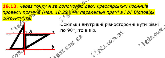 18.13. Через точку А за допомогою двох креслярських косинців провели пряму а (мал. 18.29). Чи паралельні прямі а і b? Відповідь обґрунтуйте. Оскільки внутрішні різносторонні кути рівні по 90°; то а ∥ b.