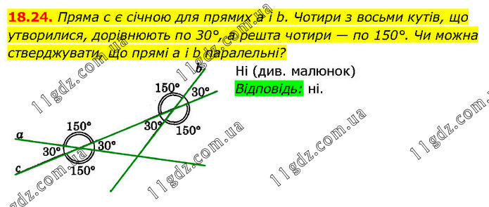 Пряма с є січною для прямих а і b. Чотири з восьми кутів, що утворилися, дорівнюють по 30°, а решта чотири — по 150°. Чи можна стверджувати, що прямі а і b паралельні? Ні (див. малюнок) Відповідь: ні.