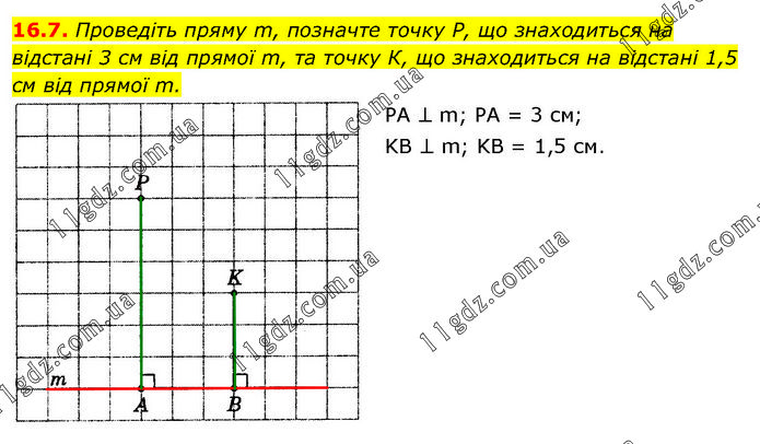 Проведіть пряму m, позначте точку Р, що знаходиться на відстані 3 см від прямої m, та точку К, що знаходиться на відстані 1,5 см від прямої m. PA ⊥ m; PA = 3 см; KB ⊥ m; KB = 1,5 см.