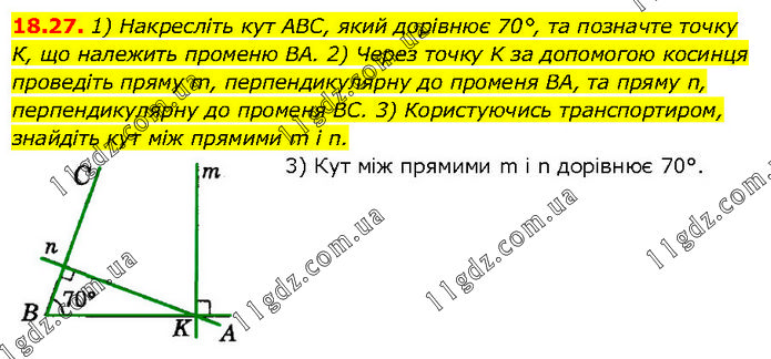 1) Накресліть кут ABC, який дорівнює 70°, та позначте точку К, що належить променю BA. 2) Через точку K за допомогою косинця проведіть пряму m, перпендикулярну до променя BA, та пряму n, перпендикулярну до променя BC. 3) Користуючись транспортиром, знайдіть кут між прямими m і n. 3) Кут між прямими m i n дорівнює 70°.