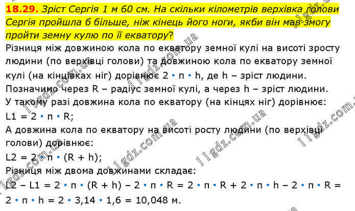 Зріст Сергія 1 м 60 см. На скільки кілометрів верхівка голови Сергія пройшла б більше, ніж кінець його ноги, якби він мав змогу пройти земну кулю по її екватору? Різниця між довжиною кола по екватору земної кулі на висоті зросту людини (по верхівці голови) та довжиною кола по екватору земної кулі (на кінцівках ніг) дорівнює 2 ∙ п ∙ h, де h – зріст людини. Позначимо через R – радіус земної кулі, а через h – зріст людини. У такому разі довжина кола по екватору (на кінцях ніг) дорівнює: L1 = 2 ∙ п ∙ R; А довжина кола по екватору на висоті росту людини (по верхівці голови) дорівнює: L2 = 2 ∙ п ∙ (R + h); Різниця між двома довжинами складає: L2 – L1 = 2 ∙ п ∙ (R + h) – 2 ∙ п ∙ R = 2 ∙ п ∙ R + 2 ∙ п ∙ h – 2 ∙ п ∙ R = 2 ∙ п ∙ h = 2 ∙ 3,14 ∙ 1,6 = 10,048 м.
