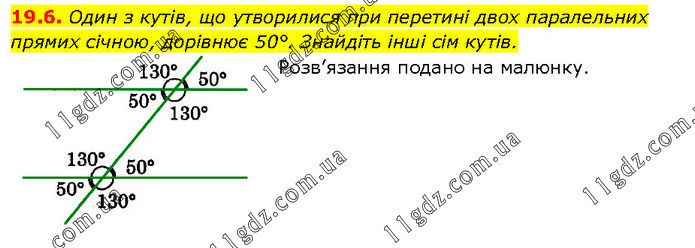 Один з кутів, що утворилися при перетині двох паралельних прямих січною, дорівнює 50°. Знайдіть інші сім кутів. Розв’язання подано на малюнку.