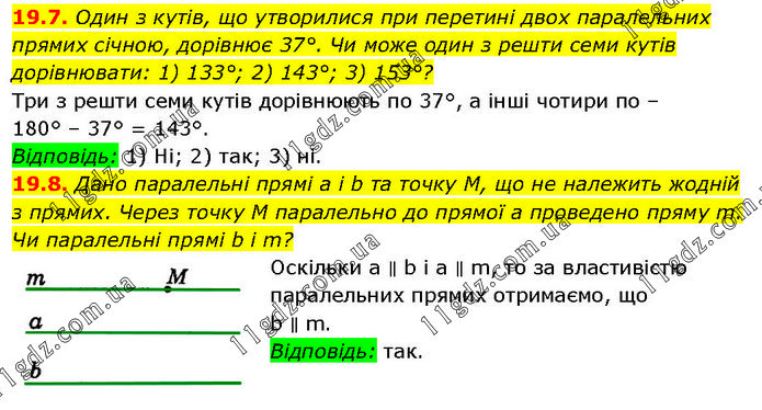 19.7. Один з кутів, що утворилися при перетині двох паралельних прямих січною, дорівнює 37°. Чи може один з решти семи кутів дорівнювати: 1) 133°; 2) 143°; 3) 153°? Три з решти семи кутів дорівнюють по 37°, а інші чотири по – 180° – 37° = 143°. Відповідь: 1) Ні; 2) так; 3) ні. 19.8. Дано паралельні прямі а і b та точку М, що не належить жодній з прямих. Через точку M паралельно до прямої а проведено пряму m. Чи паралельні прямі b і m? Оскільки a ∥ b і a ∥ m, то за властивістю паралельних прямих отримаємо, що b ∥ m. Відповідь: так.