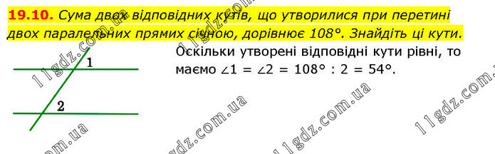 Сума двох відповідних кутів, що утворилися при перетині двох паралельних прямих січною, дорівнює 108°. Знайдіть ці кути. Оскільки утворені відповідні кути рівні, то маємо ∠1 = ∠2 = 108° : 2 = 54°.