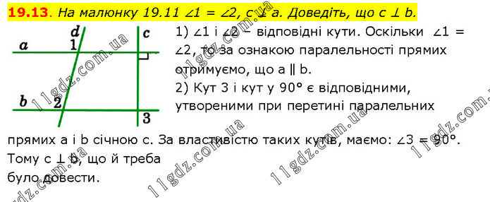 На малюнку 19.11 ∠1 = ∠2, с ⊥ а. Доведіть, що с ⊥ b. 1) ∠1 і ∠2 – відповідні кути. Оскільки ∠1 = ∠2, то за ознакою паралельності прямих отримуємо, що а ∥ b. 2) Кут 3 і кут у 90° є відповідними, утвореними при перетині паралельних прямих а і b січною с. За властивістю таких кутів, маємо: ∠3 = 90°. Тому с ⊥ b, що й треба було довести.