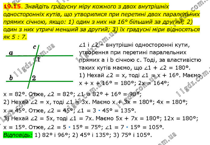 Знайдіть градусну міру кожного з двох внутрішніх односторонніх кутів, що утворилися при перетині двох паралельних прямих січною, якщо: 1) один з них на 16° більший за другий; 2) один з них утричі менший за другий; 3) їх градусні міри відносяться як 5 : 7. ∠1 і ∠2 – внутрішні односторонні кути, утворення при перетині паралельних прямих а і b січною c. Тоді, за властивістю таких кутів маємо, що ∠1 + ∠2 = 180°. 1) Нехай ∠2 = х, тоді ∠1 = х + 16°. Маємо х + х + 16° = 180°; 2х = 164°; х = 82°. Отже, ∠2 = 82°; ∠1 = 82° + 16° = 98°; 2) Нехай ∠2 = х, тоді ∠1 = 3х. Маємо х + 3х = 180°; 4х = 180°; х = 45°. Отже, ∠2 = 45°; ∠1 = 3 ∙ 45° = 135°. 3) Нехай ∠2 = 5х, тоді ∠1 = 7х. Маємо 5х + 7х = 180°; 12х = 180°; х = 15°. Отже, ∠2 = 5 ∙ 15° = 75°; ∠1 = 7 ∙ 15° = 105°. Відповідь: 1) 82° і 96°; 2) 45° і 135°; 3) 75° і 105°.