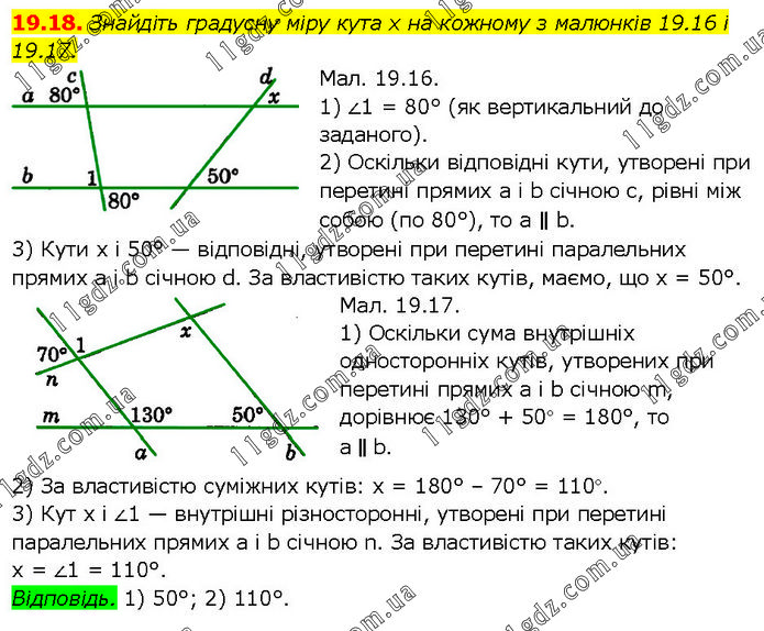 Знайдіть градусну міру кута х на кожному з малюнків 19.16 і 19.17. Мал. 19.16. 1) ∠1 = 80° (як вертикальний до заданого). 2) Оскільки відповідні кути, утворені при перетині прямих а і b січною с, рівні між собою (по 80°), то а ∥ b. 3) Кути х і 50° — відповідні, утворені при перетині паралельних прямих а і b січною d. За властивістю таких кутів, маємо, що х = 50°. Мал. 19.17. 1) Оскільки сума внутрішніх односторонніх кутів, утворених при перетині прямих а і b січною m, дорівнює 130° + 50° = 180°, τо а ∥ b. 2) За властивістю суміжних кутів: х = 180° – 70° = 110°. 3) Кут х і ∠1 — внутрішні різносторонні, утворені при перетині паралельних прямих а і b січною n. За властивістю таких кутів: x = ∠1 = 110°. Відповідь. 1) 50°; 2) 110°.