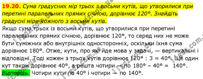 Сума градусних мір трьох з восьми кутів, що утворилися при перетині паралельних прямих січною, дорівнює 120°. Знайдіть градусні міри кожного з восьми кутів. Якщо сума трьох із восьми кутів, що утворилися при перетині паралельних прямих січною, дорівнює 120°, то серед них не може бути суміжних або внутрішніх односторонніх, оскільки їхня сума дорівнює 180°. Отже, кути, про які йде мова у задачі, — вертикальні і відповідні. Тоді кожен з трьох кутів дорівнює 120° : 3 = 40°. Ще один кут також дорівнює 40°, а решта чотири — по 180° – 40° = 140°. Відповідь. Чотири кути по 40° і чотири — по 140°.