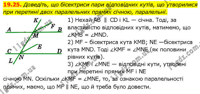Доведіть, що бісектриси пари відповідних кутів, що утворилися при перетині двох паралельних прямих січною, паралельні. 1) Нехай AB ∥ CD і KL — січна. Тоді, за властивістю відповідних кутів, матимемо, що ∠KMB = ∠MND. 2) MF – бісектриса кута KMB; NE —бісектриса кута MND. Тоді ∠KMF = ∠MNE (як половини рівних кутів). 3) ∠KMF і ∠MNE — відповідні кути, утворені при перетині прямих MF і NE січною MN. Оскільки ∠KMF = ∠MNE, то, за ознакою паралельності прямих, маємо, що MF ∥ NE, що й треба було довести.