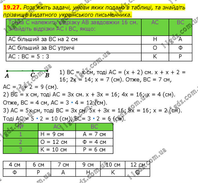 Розв’яжіть задачі, умови яких подано в таблиці, та знайдіть прізвище видатного українського письменника. 1) BC = х см, тоді AC = (х + 2) см. х + х + 2 = 16; 2х = 14; х = 7 (см). Отже, BC = 7 см, AC = 7 + 2 = 9 (см). 2) BC = х см, тоді AC = Зх см. х + Зх = 16; 4х = 16; х = 4 (см). Отже, BC = 4 см, AC = 3 ∙ 4 = 12 (см). 3) AC = 5х см, тоді BC = Зх см. 5х + Зх = 16; 8х = 16; х = 2 (см). Тоді AC = 5 ∙ 2 = 10 (см), BC= 3 ∙ 2 = 6 (см).