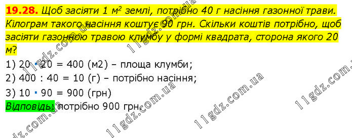 Щоб засіяти 1 м2 землі, потрібно 40 г насіння газонної трави. Кілограм такого насіння коштує 90 грн. Скільки коштів потрібно, щоб засіяти газонною травою клумбу у формі квадрата, сторона якого 20 м? 1) 20 ∙ 20 = 400 (м2) – площа клумби; 2) 400 : 40 = 10 (г) – потрібно насіння; 3) 10 ∙ 90 = 900 (грн) Відповідь: потрібно 900 грн.