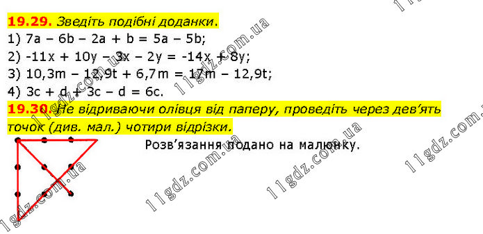 19.29. Зведіть подібні доданки. 1) 7а – 6b – 2a + b = 5a – 5b; 2) -11x + 10y – 3x – 2y = -14x + 8y; 3) 10,3m – 12,9t + 6,7m = 17m – 12,9t; 4) 3c + d + 3c – d = 6c. 19.30. Не відриваючи олівця від паперу, проведіть через дев’ять точок (див. мал.) чотири відрізки. Розв’язання подано на малюнку.