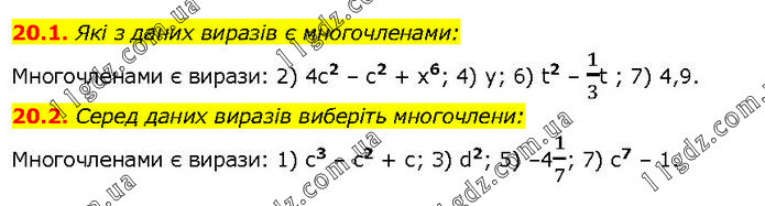 20.1. Які з даних виразів є многочленами: Многочленами є вирази: 2) 4c2 – c2 + х6; 4) y; 6) t2 – 1/3t ; 7) 4,9. 20.2. Серед даних виразів виберіть многочлени: Многочленами є вирази: 1) c3 – c2 + c; 3) d2; 5) –41/7; 7) c7 – 1.