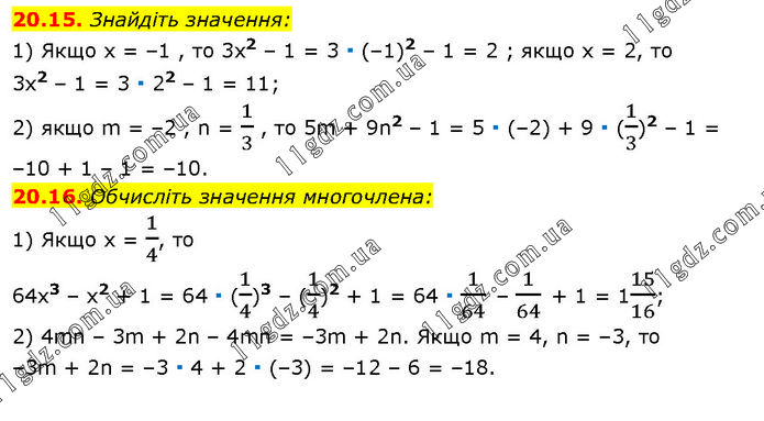 20.15. Знайдіть значення: 1) Якщо х = –1 , то 3х2 – 1 = 3 ∙ (–1)2 – 1 = 2 ; якщо х = 2, то 3х2 – 1 = 3 ∙ 22 – 1 = 11; 2) якщо m = –2 , n = 1/3 , то 5m + 9n2 – 1 = 5 ∙ (–2) + 9 ∙ (1/3)2 – 1 = –10 + 1 – 1 = –10. 20.16. Обчисліть значення многочлена: 1) Якщо х = 1/4, то 64х3 – x2 + 1 = 64 ∙ (1/4)3 – (1/4)2 + 1 = 64 ∙ 1/64 – 1/64 + 1 = 115/16; 2) 4mn – 3m + 2n – 4mn = –3m + 2n. Якщо m = 4, n = –3, то –3m + 2n = –3 ∙ 4 + 2 ∙ (–3) = –12 – 6 = –18.