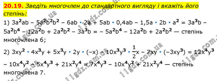 20.19. Зведіть многочлен до стандартного вигляду і вкажіть його степінь: 1) 3a2ab – 5а2b2b2 – 6ab ∙ 2а + 5аb ∙ 0,4ab – 1,5а ∙ 2b ∙ а2 = 3a3b – 5а2b4 – 12а2b + 2a2b2 – 3а3b = – 5а2b4 – 12а2b + 2а2b2 — степінь многочлена 6; 2) 3ху2 ∙ 4x3у + 5х3у ∙ 2у ∙ (–х) – 10х3y3 ∙ 1/2х – 7ху ∙ (–3хy3) = 12х4y3 – 10х4y2 – 5х4y3 + 21х2y4 = 7х4y3 – 10х4y2 + 21х2y4 — степінь многочлена 7.