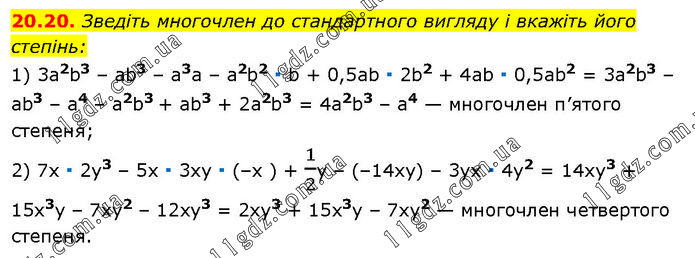20.20. Зведіть многочлен до стандартного вигляду і вкажіть його степінь: 1) 3a2b3 – аb3 – а3а – а2b2 ∙ b + 0,5ab ∙ 2b2 + 4ab ∙ 0,5аb2 = 3a2b3 – ab3 – а4 – a2b3 + ab3 + 2а2b3 = 4a2b3 – а4 — многочлен п’ятого степеня; 2) 7х ∙ 2y3 – 5х ∙ 3ху ∙ (–x ) + 1/2y – (–14хy) – 3ух ∙ 4y2 = 14xy3 + 15х3у – 7xy2 – 12ху3 = 2хy3 + 15х3y – 7хy2 — многочлен четвертого степеня.