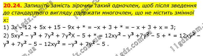 20.24. Запишіть замість зірочки такий одночлен, щоб після зведення до стандартного вигляду одержати многочлен, що не містить змінної x: 1) 3х – 12 + 5х + 15 – 9x + * = –x + 3 + * = – x + 3 + x = 3; 2) 5хy2 – y3 + 7y2 + 7y2X – 5 + * = 12ху2 – y3 +7y2 – 5 + * = 12xy2 – y3 + 7y2 – 5 – 12хy2 = –y3 + 7y2 – 5.