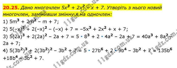 Дано многочлен 5х3 + 2х2 – х + 7. Утворіть з нього новий многочлен, замінивши змінну х на одночлен: 1) 5m3 + 2m2 – m + 7; 2) 5(–х)3 + 2(–х)2 – (–х) + 7 = –5х3 + 2x2 + х + 7; 3) 5(2а)3 + 2(2а)2 – 2а + 7 = 5 ∙ 83 + 2 ∙ 4а2 – 2а + 7 = 40а3 + 8а2 – 2а + 7; 4) 5(3b2)3 + 2(3b2)2 – 3b2 + 7 = 5 ∙ 27b6 + 2 ∙ 9b4 – 3b2 + 7 = 135b6 +18b4 – 3b2 + 7.