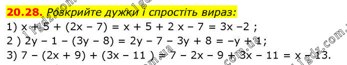 Розкрийте дужки і спростіть вираз: 1) х + 5 + (2х – 7) = х + 5 + 2 х – 7 = 3х –2; 2) 2у – 1 – (3у – 8) = 2у – 7 – 3у + 8 = –у + 1; 3) 7 – (2x + 9) + (3х – 11 ) = 7 – 2x – 9 + 3x – 11 = x – 13.