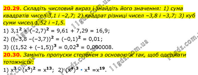20.29. Складіть числовий вираз і знайдіть його значення: 1) сума квадратів чисел 3,1 і –2,7; 2) квадрат різниці чисел –3,8 і –3,7; 3) куб суми чисел 1,52 і –1,5. 1) 3,12 + (–2,7)2 = 9,61 + 7,29 = 16,9; 2) ((–3,8 –(–3,7))2 = (–0,1)2 = 0,01; 3) ((1,52 + (–1,5))3 = 0,023 = 0,000008. 20.30. Замініть пропуски степенем з основою ж так, щоб одержати тотожність: 1) x3 ∙ (х5)2 = x13; 2) (х4)3 ∙ x1 =x19.