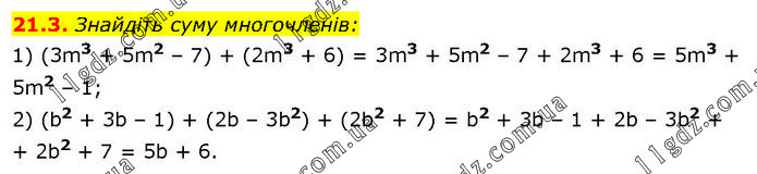 Знайдіть суму многочленів: 1) (3m3 + 5m2 – 7) + (2m3 + 6) = 3m3 + 5m2 – 7 + 2m3 + 6 = 5m3 + 5m2 – 1; 2) (b2 + 3b – 1) + (2b – 3b2) + (2b2 + 7) = b2 + 3b – 1 + 2b – 3b2 + + 2b2 + 7 = 5b + 6.