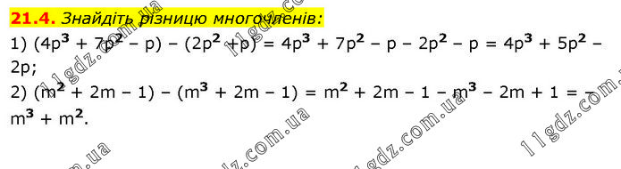 Знайдіть різницю многочленів: 1) (4p3 + 7p2 – р) – (2p2 +р) = 4p3 + 7p2 – р – 2p2 – р = 4p3 + 5p2 – 2р; 2) (m2 + 2m – 1) – (m3 + 2m – 1) = m2 + 2m – 1 – m3 – 2m + 1 = –m3 + m2.