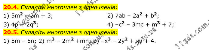 20.4. Складіть многочлен з одночленів: 1) 5m2 – 2m + 3; 3) 4р + 2q3; 2) 7ab – 2a2 + b2; 4) –с2 – 3mс + m3 + 7; 20.5. Складіть многочлен з одночленів: 1) 5m – 5n; 2) m3 – 2m2 +mn; 3) –х3 – 2у2 + ху + 4.