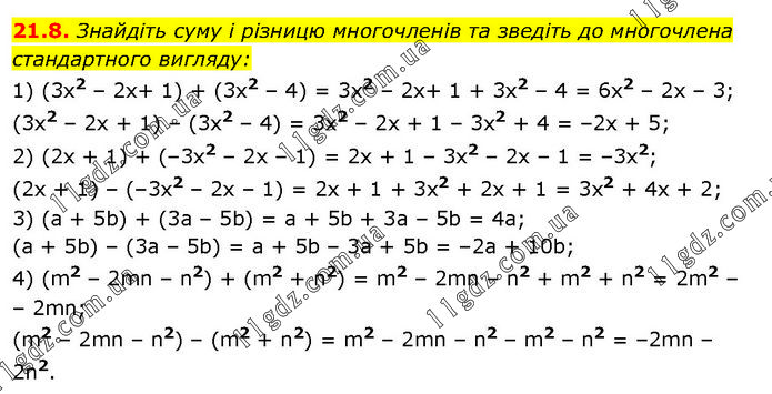 Знайдіть суму і різницю многочленів та зведіть до многочлена стандартного вигляду: 1) (3x2 – 2х+ 1) + (3х2 – 4) = 3х2 – 2х+ 1 + 3x2 – 4 = 6х2 – 2х – 3; (3х2 – 2х + 1) – (3x2 – 4) = 3х2 – 2х + 1 – 3x2 + 4 = –2х + 5; 2) (2х + 1) + (–3х2 – 2х – 1) = 2х + 1 – 3х2 – 2х – 1 = –3х2; (2х + 1) – (–3х2 – 2х – 1) = 2х + 1 + 3х2 + 2х + 1 = 3х2 + 4х + 2; 3) (а + 5b) + (3а – 5b) = а + 5b + 3а – 5b = 4а; (а + 5b) – (3а – 5b) = а + 5b – 3а + 5b = –2а + 10b; 4) (m2 – 2mn – n2) + (m2 + n2) = m2 – 2mn – n2 + m2 + n2 = 2m2 – – 2mn; (m2 – 2mn – n2) – (m2 + n2) = m2 – 2mn – n2 – m2 – n2 = –2mn – 2n2.