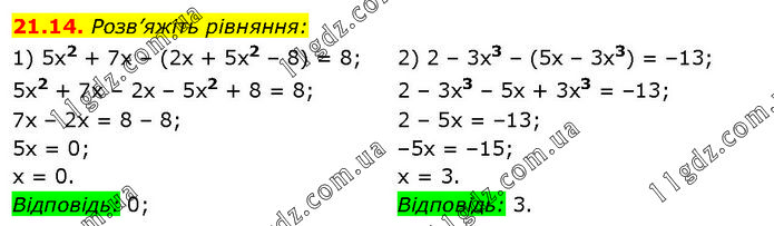 Розв’яжіть рівняння: 1) 5х2 + 7х – (2х + 5х2 – 8) = 8; 5х2 + 7х – 2х – 5х2 + 8 = 8; 7х – 2х = 8 – 8; 5х = 0; х = 0. Відповідь: 0; 2) 2 – 3х3 – (5х – 3х3) = –13; 2 – 3х3 – 5x + 3х3 = –13; 2 – 5х = –13; –5х = –15; х = 3. Відповідь: 3.
