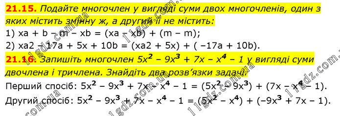 21.15. Подайте многочлен у вигляді суми двох многочленів, один з яких містить змінну ж, а другий її не містить: 1) ха + b – m – xb = (ха – xb) + (m – m); 2) ха2 – 17а + 5х + 10b = (ха2 + 5х) + ( –17а + 10b). 21.16. Запишіть многочлен 5х2 – 9х3 + 7x – х4 – 1 у вигляді суми двочлена і тричлена. Знайдіть два розв’язки задачі. Перший спосіб: 5х2 – 9х3 + 7x – х4 – 1 = (5х2 – 9х3) + (7х – х4 – 1). Другий спосіб: 5х2 – 9х3 + 7х – х4 – 1 = (5х2 – х4) + (–9х3 + 7x – 1).