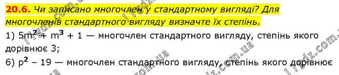 20.6. Чи записано многочлен у стандартному вигляді? Для многочленів стандартного вигляду визначте їх степінь. 1) 5m2 + m3 + 1 — многочлен стандартного вигляду, степінь якого дорівнює 3; 6) р2 – 19 — многочлен стандартного вигляду, степінь якого дорівнює