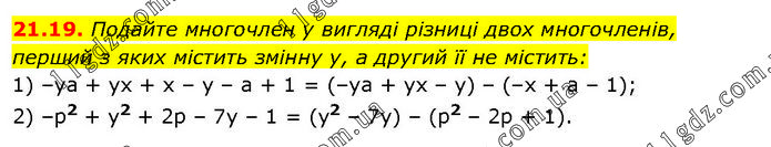 Подайте многочлен у вигляді різниці двох многочленів, перший з яких містить змінну у, а другий її не містить: 1) –уа + ух + х – у – а + 1 = (–уа + ух – у) – (–х + а – 1); 2) –р2 + у2 + 2р – 7y – 1 = (у2 – 7у) – (р2 – 2р + 1).