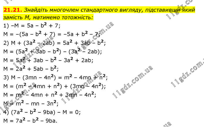 Знайдіть многочлен стандартного вигляду, підставивши який замість М, матимемо тотожність: 1) –M = 5a – b2 + 7; M = –(5a – b2 + 7) = –5a + b2 – 7; 2) M + (3a2 – 2ab) = 5a2 + 3ab – b2; M = (5a2 + 3ab – b2) – (3a2 – 2ab); M = 5a2 + 3ab – b2 – 3a2 + 2ab; M = 2a2 + 5ab – b2; 3) M – (3mn – 4n2) = m2 – 4mn + n2; M = (m2 – 4mn + n2) + (3mn – 4n2); M = m2 – 4mn + n2 + 3mn – 4n2; M = m2 – mn – 3n2; 4) (7a2 – b2 – 9ba) – M = 0; M = 7a2 – b2 – 9ba.