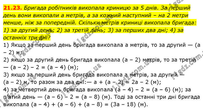Бригада робітників викопала криницю за 5 днів. За перший день вони викопали а метрів, а за кожний наступний – на 2 метри менше, ніж за попередній. Скільки метрів криниці викопала бригада: 1) за другий день; 2) за третій день; 3) за перших два дні; 4) за останніх три дні? 1) Якщо за перший день бригада викопала а метрів, то за другий — (а – 2) м; 2) якщо за другий день бригада викопала (а – 2) метрів, то за третій — (а – 2) – 2 = (а – 4) (м); 3) якщо за перший день бригада викопала а метрів, за другий — (а – 2) м, то разом за два дні:— a + (a – 2) = 2a – 2 (м); 4) за четвертий день бригада викопала (а – 4) – 2 = (а – 6) (м); за п’ятий день — (а – 6) – 2 = (а – 8) (м). Тоді за останні три дні бригада викопала (a – 4) + (а – 6) + (а – 8) = (3а – 18) (м).