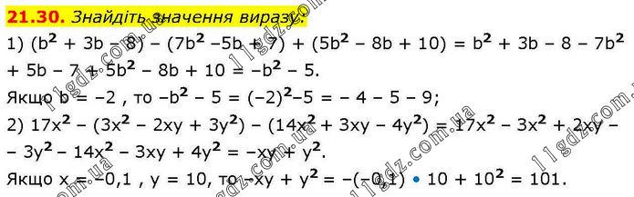 Знайдіть значення виразу: 1) (b2 + 3b – 8) – (7b2 –5b + 7) + (5b2 – 8b + 10) = b2 + 3b – 8 – 7b2 + 5b – 7 + 5b2 – 8b + 10 = –b2 – 5. Якщо b = –2 , то –b2 – 5 = (–2)2–5 = – 4 – 5 – 9; 2) 17x2 – (3х2 – 2ху + 3у2) – (14х2 + Зху – 4у2) = 17x2 – Зх2 + 2ху – – 3у2 – 14х2 – Зху + 4у2 = –ху + у2. Якщо х = –0,1 , у = 10, то –ху + у2 = –(–0,1) • 10 + 102 = 101.