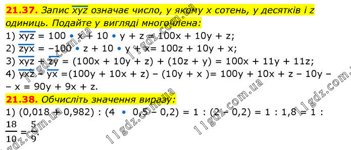 21.37. Запис хуz означає число, у якому x сотень, у десятків і z одиниць. Подайте у вигляді многочлена: 1) xyz = 100 • x + 10 • y + z = 100x + 10y + z; 2) zyx = –100 • z + 10 • у + х= 100z + 10у + х; 3) xyz + zy = (100x + 10y + z) + (10z + у) = 100x + 11y + 11z; 4) yxz – yx =(100у + 10x + z) – (10y + x )= 100y + 10x + z – 10y – – х = 90у + 9х + z. 21.38. Обчисліть значення виразу: (0,018 + 0,982) : (4 • 0,5 – 0,2) = 1 : (2 – 0,2) = 1 : 1,8 = 1 : 18/10 = 5/9.