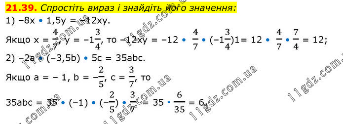Спростіть вираз і знайдіть його значення: 1) –8х • 1,5у = –12ху. Якщо х = 4/7, у = –13/4, то –12хy = –12 • 4/7 • (–13/4)1= 12 • 4/7 • 7/4 = 12; 2) –2а • (–3,5b) • 5c = 35abc. Якщо а = – 1, b = –2/5, с = 3/7, то 35abc = 35 • (–1) • (–2/5) • 3/7 = 35 ∙ 6/35 = 6.